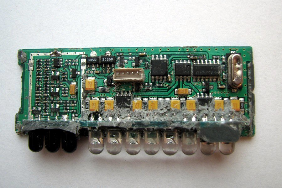 Lower left corner shows 3 receiving IR photodiodes. Signal then goes to the wideband amplifier followed by fast comparator. Signal is then processed in the digital part (located in the middle and right half of the picture).