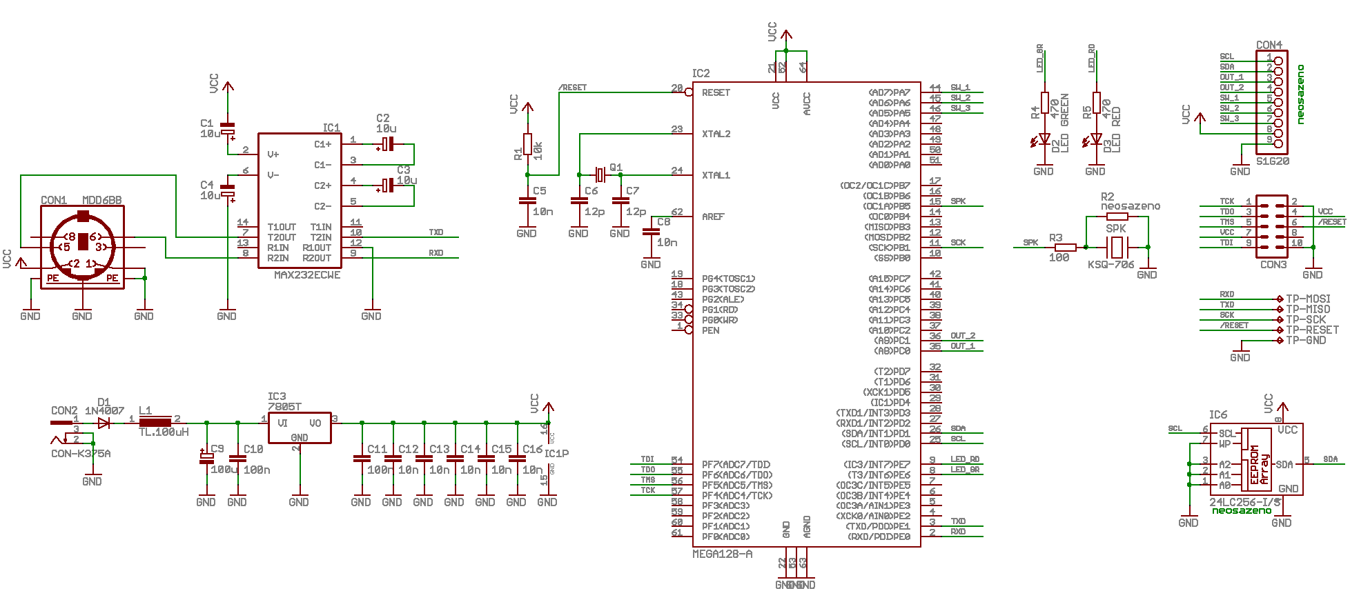 Ve schématu je též pamět EEPROM a konektor pro připojení displeje a klávesnice. V současné verzi ale nejsou využity.